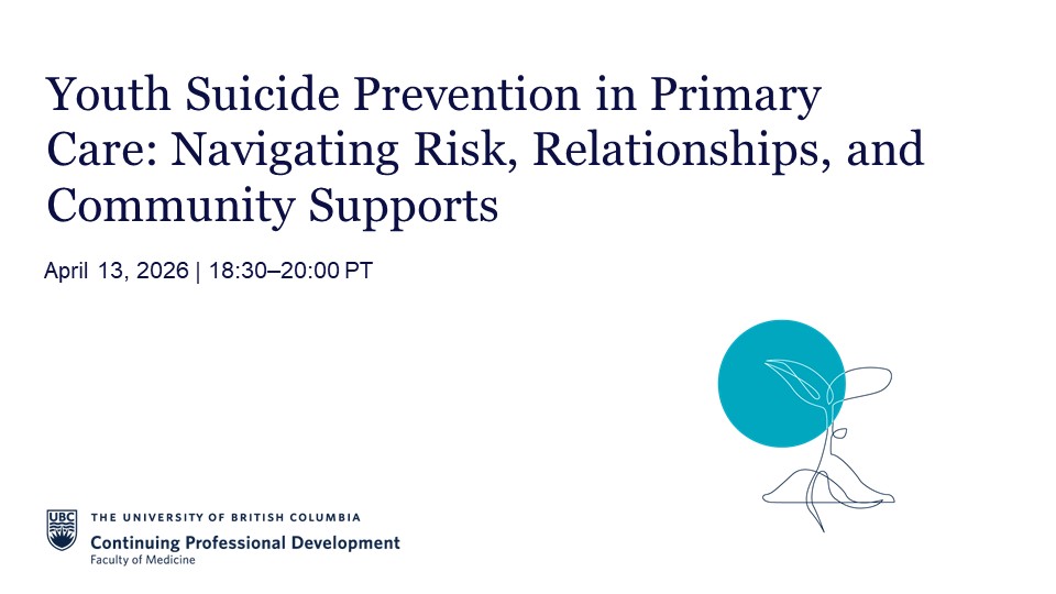In partnership with the Child & Youth Mental Health and Substance Use Community of Practice, this session explores the roots of suicidal ideation among youth, how to approach these conversations with sensitivity, and the use of relational strategies to assess and respond to suicide risk. Participants will gain practical guidance for managing acute and long‑term needs, building trust, and connecting patients with appropriate supports.